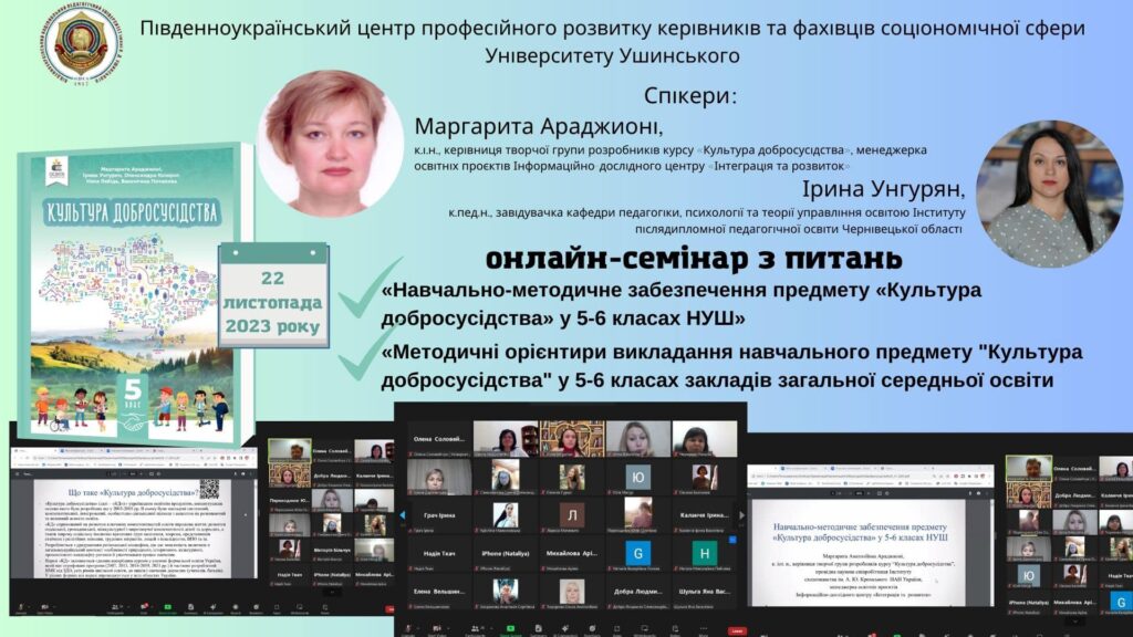 22 листопада 2023 року на базі Південноукраїнського центру професійного розвитку керівників та фахівців соціономічної сфери Університету Ушинського відбувся онлайн-семінар щодо тем навчально-методичного забезпечення предмету «Культура добросусідства» у 5-6 класах НУШ та методичних орієнтирів викладання навчального предмету «Культура добросусідства» у 5-6 класах закладів загальної середньої освіти.